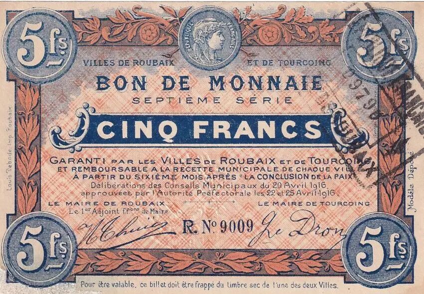 Le billet provient du département du Nord (59), et plus précisément des communes de Roubaix et Tourcoing. Il fait partie de la 7ème série, portant le numéro R9009.
