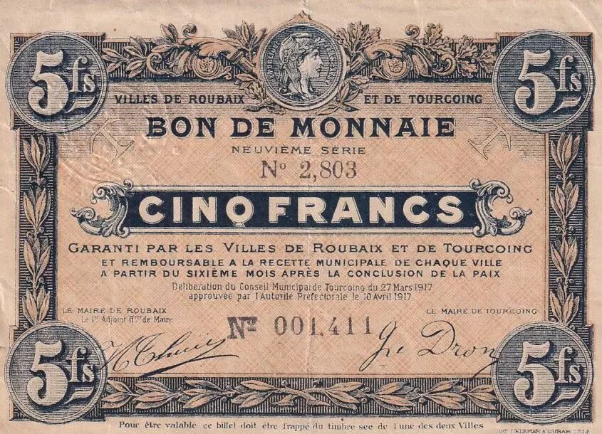This emergency banknote, with a value of 5 francs, was issued on March 27, 1917. It is part of the series of emergency issues common to cities during the period from 1914 to 1918, an era marked by the economic and monetary constraints of the First World War.
