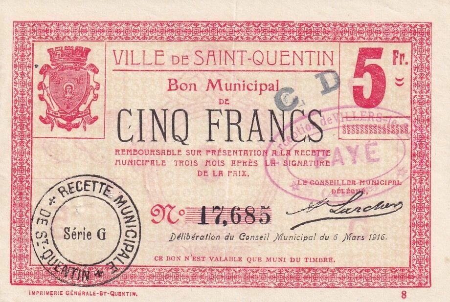 Sur le recto, le papier est de couleur crème, avec des impressions en rouge et noir. En haut, on trouve la mention "VILLE DE SAINT-QUENTIN" suivie de "Bon Municipal de CINQ FRANCS". Le chiffre "5 Fr." est imprimé en grand dans le coin supérieur droit. Les armoiries de la ville figurent dans un cartouche rouge en haut à gauche. Une clause de remboursement précise que le bon est "REMBOURSABLE SUR PRÉSENTATION À LA RECETTE MUNICIPALE TROIS MOIS APRÈS LA SIGNATURE DE LA PAIX." Le numéro de série, "N° 17.685", est imprimé au centre. Le billet porte la date de la "Délibération du Conseil Municipal du 6 Mars 1916", une signature illisible précédée du titre "LE CONSEILLER MUNICIPAL DÉLÉGUÉ", ainsi que plusieurs tampons ou cachets en encre violette et un grand cachet circulaire noir dans le coin inférieur gauche avec l'inscription "DE LA RECETTE MUNICIPALE DE ST-QUENTIN - Série G". Une note en bas indique : "CE BON N'EST VALABLE QUE MUNI DU TIMBRE." L'imprimeur, "IMPRIMERIE GÉNÉRALE-ST-QUENTIN", est mentionné en bas.