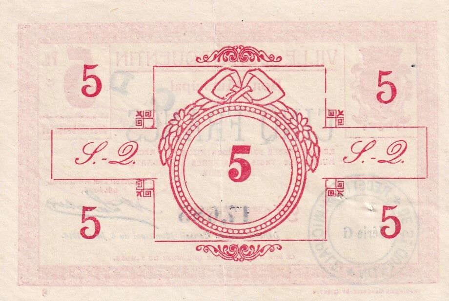Ce billet de 5 Francs est un bon municipal émis par la ville de Saint-Quentin, daté du 6 mars 1916, en pleine période de la Première Guerre mondiale. Il s'agit d'une monnaie de nécessité, une forme de substitution monétaire utilisée en temps de crise économique ou de conflit.