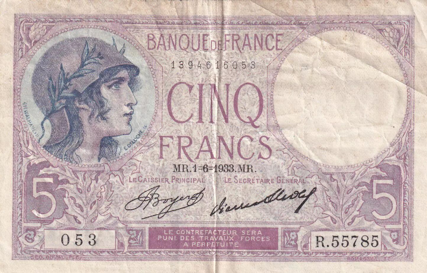 Accueil > Archivage > France 5 Francs - Violet - 01-06-1933 - Série R.55785- F.03.17