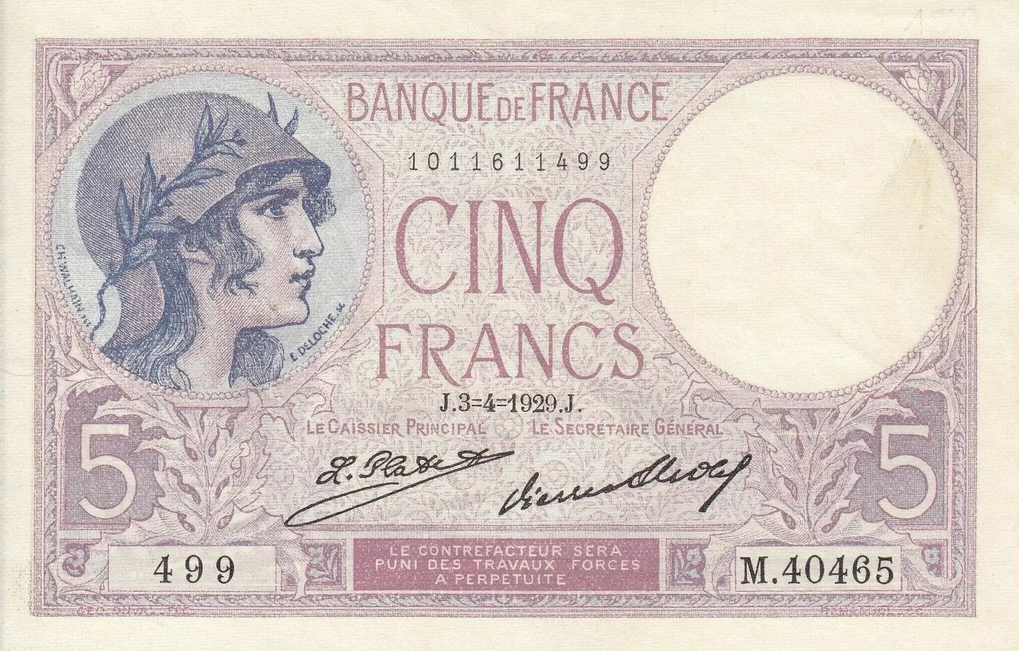 Le billet de 5 Francs de 1929 représente une période spécifique de l'histoire économique et sociale de la France. Sa conception reflète les normes esthétiques et les préoccupations sécuritaires de l'époque. En tant qu'artefact historique, il offre un aperçu précieux du système financier et des valeurs culturelles de la France dans l'entre-deux-guerres.