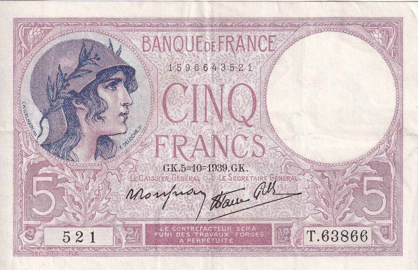 Accueil > Archivage > France 5 Francs - Violet - 05 -10-1939 - Série T.63866 - F.04.11