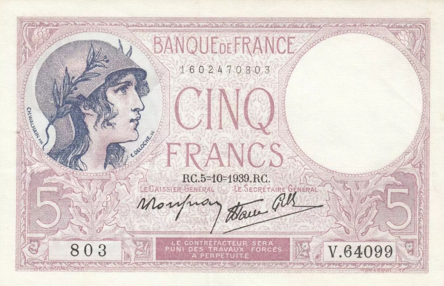 Accueil > Archivage > archivage-Archivage > France 5 Francs - Violet - 05-10-1939 - Série V.64099