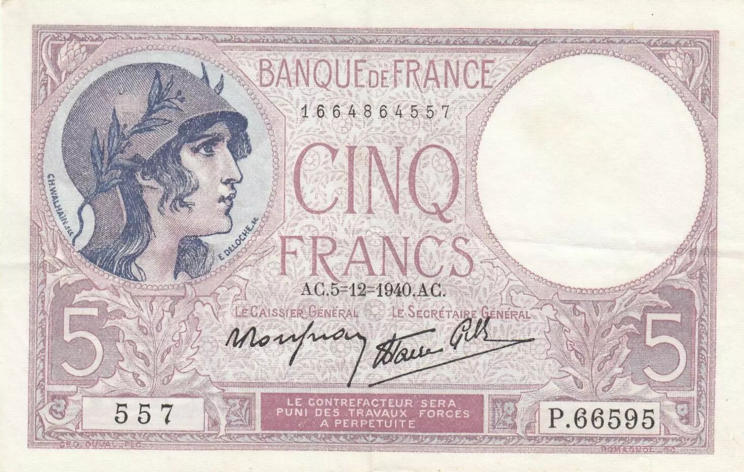 Accueil > Archivage > archivage-Billets Français > France 5 Francs - Violet - 05-12-1940 - Série P.66595