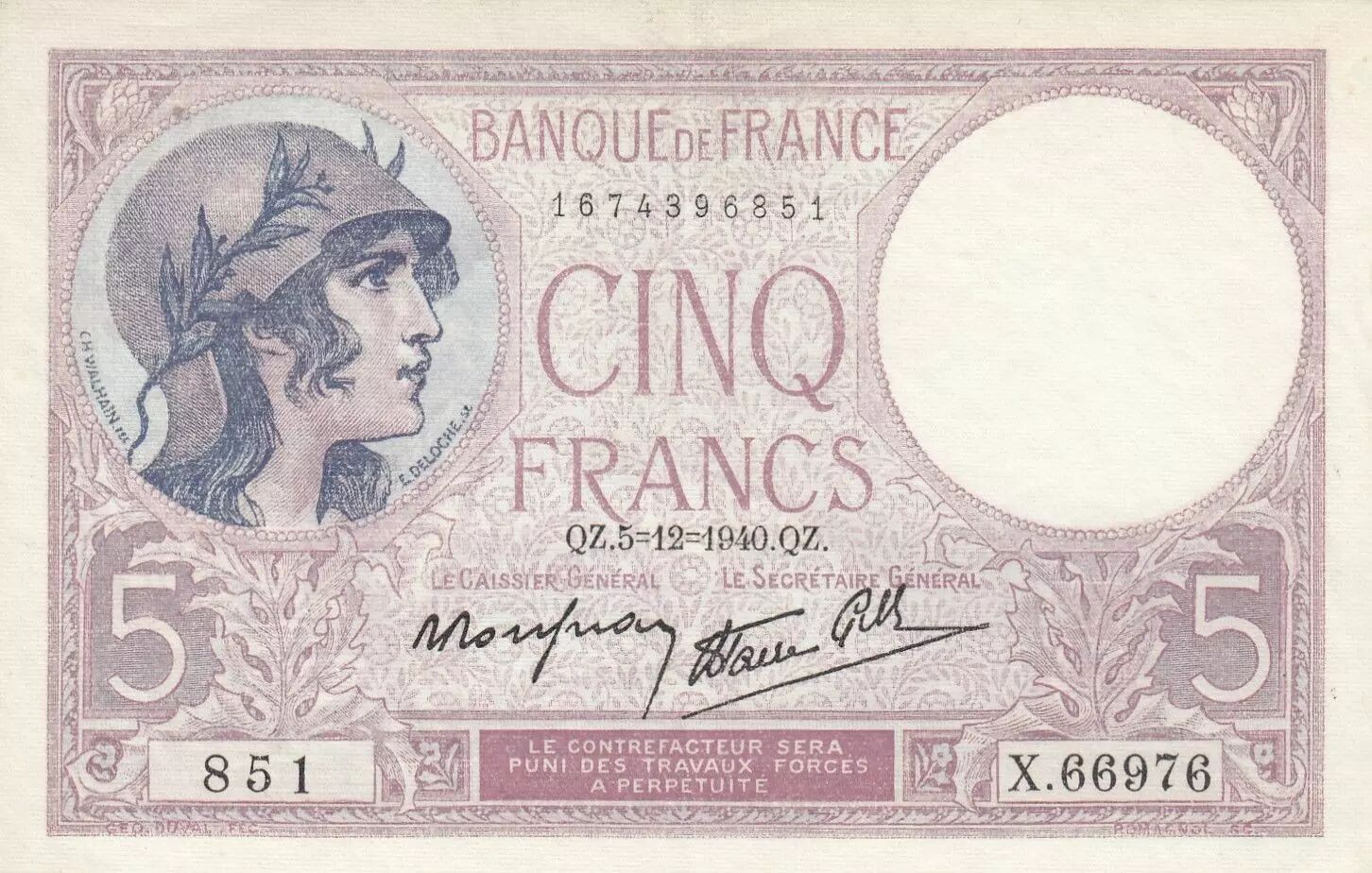 Accueil > Archivage > France 5 Francs - Violet - 05-12-1940 - Série X.66976