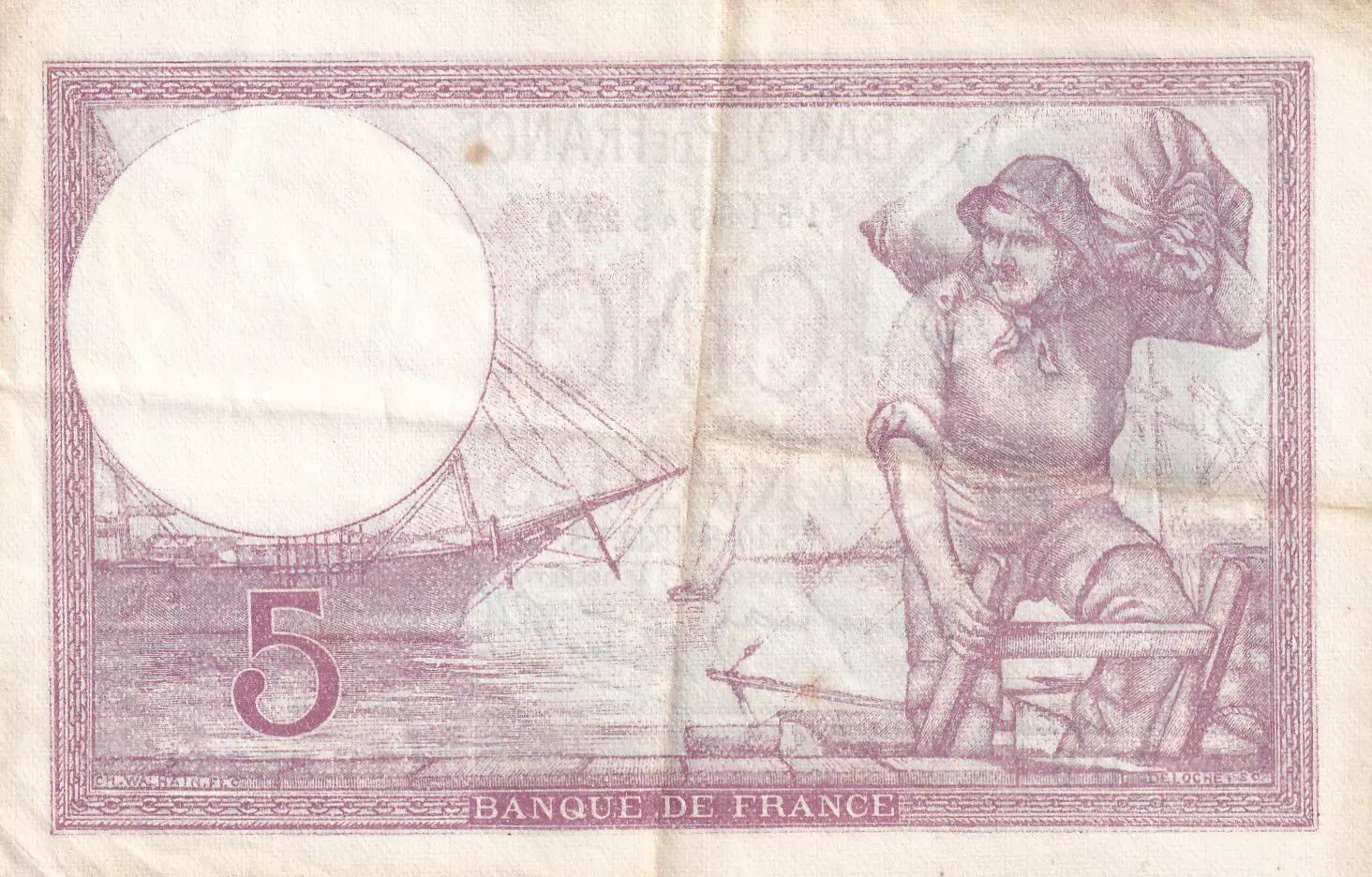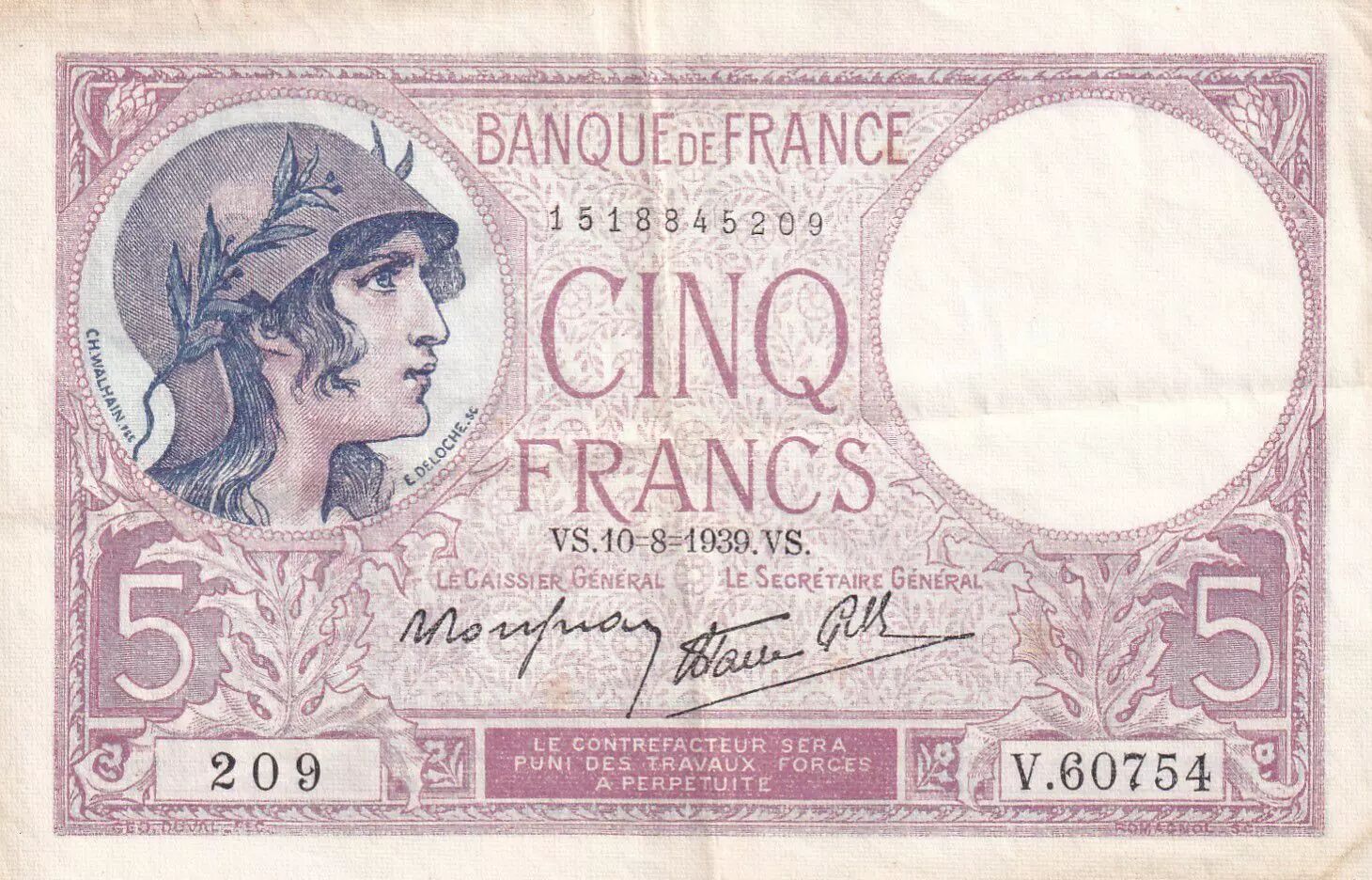 Accueil > Archivage > France 5 Francs - Violet - 10-08-1939 - Série V.60754 - F.04.05