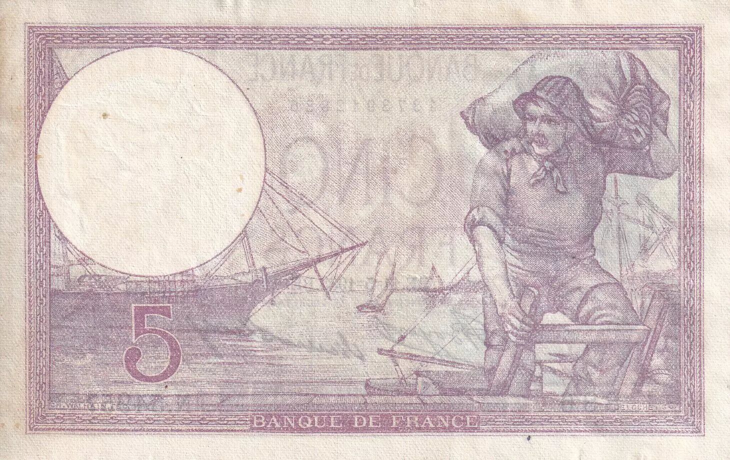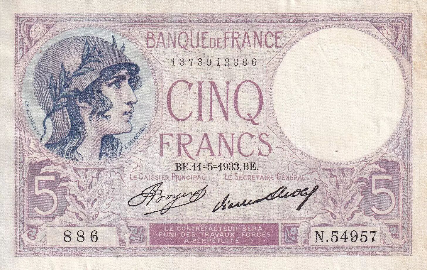 Accueil > Archivage > France 5 Francs - Violet - 11-05-1933 - Série N.54957 - F.03.17