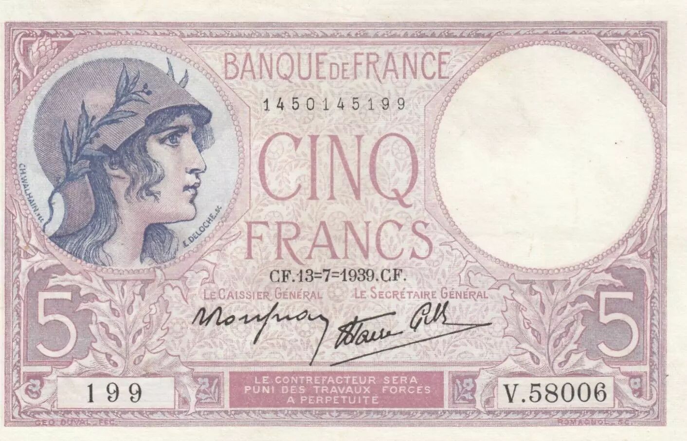 Le recto du billet comporte des illustrations et des inscriptions officielles. La valeur nominale, "5 Francs", est clairement indiquée en chiffres et en lettres. Des représentations allégoriques ou des figures historiques françaises peuvent être présentes, symbolisant des valeurs telles que la liberté, l'industrie ou l'agriculture. Le nom de la banque émettrice, ainsi que les signatures des responsables de l'émission, figurent également sur le recto. La date d'émission, "13-07-1939", est imprimée pour identifier la version spécifique du billet.