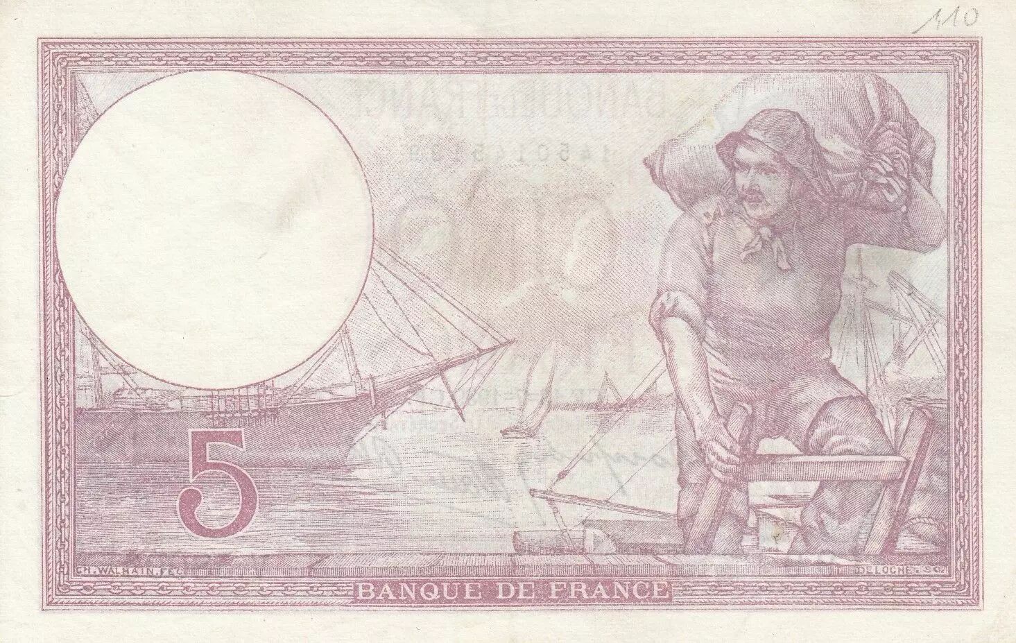 Ce billet de banque français a une valeur nominale de cinq francs. Il a été émis en 1939. Le billet appartient à une série identifiée par la lettre "V" suivie du numéro 58006.