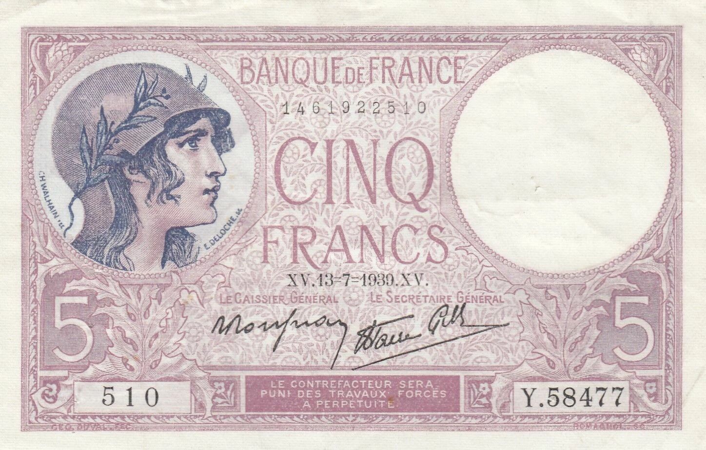 Le billet de 5 Francs, émis le 13 juillet 1939, est un témoignage de l'histoire monétaire française. Il appartient à une série identifiée par le code Y.58477.