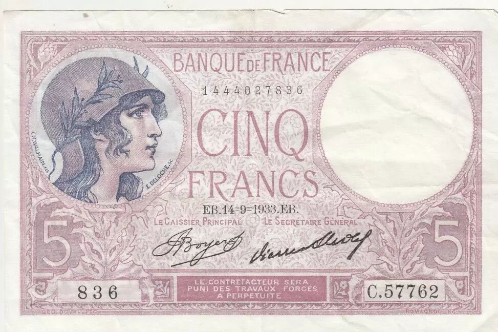 Accueil > Archivage > archivage-Billets Français > France 5 Francs - Violet - 14-09-1933 - Série C.57762