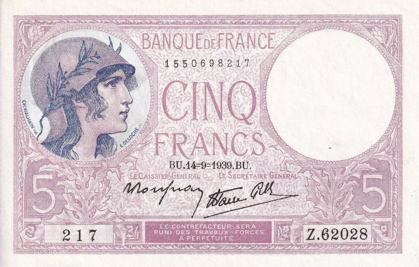 Home > > France 5 Francs - Violet - 14-09-1939 - Serial Z.62028 - AU - P.79