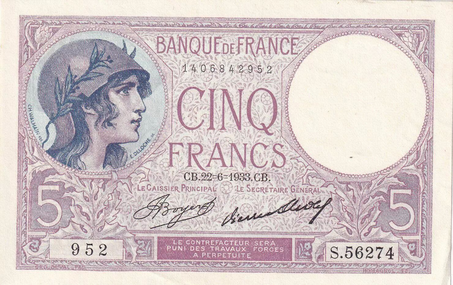 Home > > France 5 Francs - Violet - 1933 - Serial S.56274 - AU - P.72