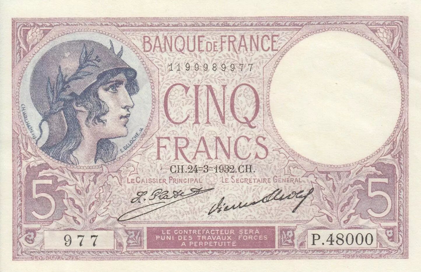 Le billet de 5 francs, daté du 24 mars 1932, est un produit de la Banque de France. Il est identifié par la série P.48000. Sa couleur dominante est le violet.