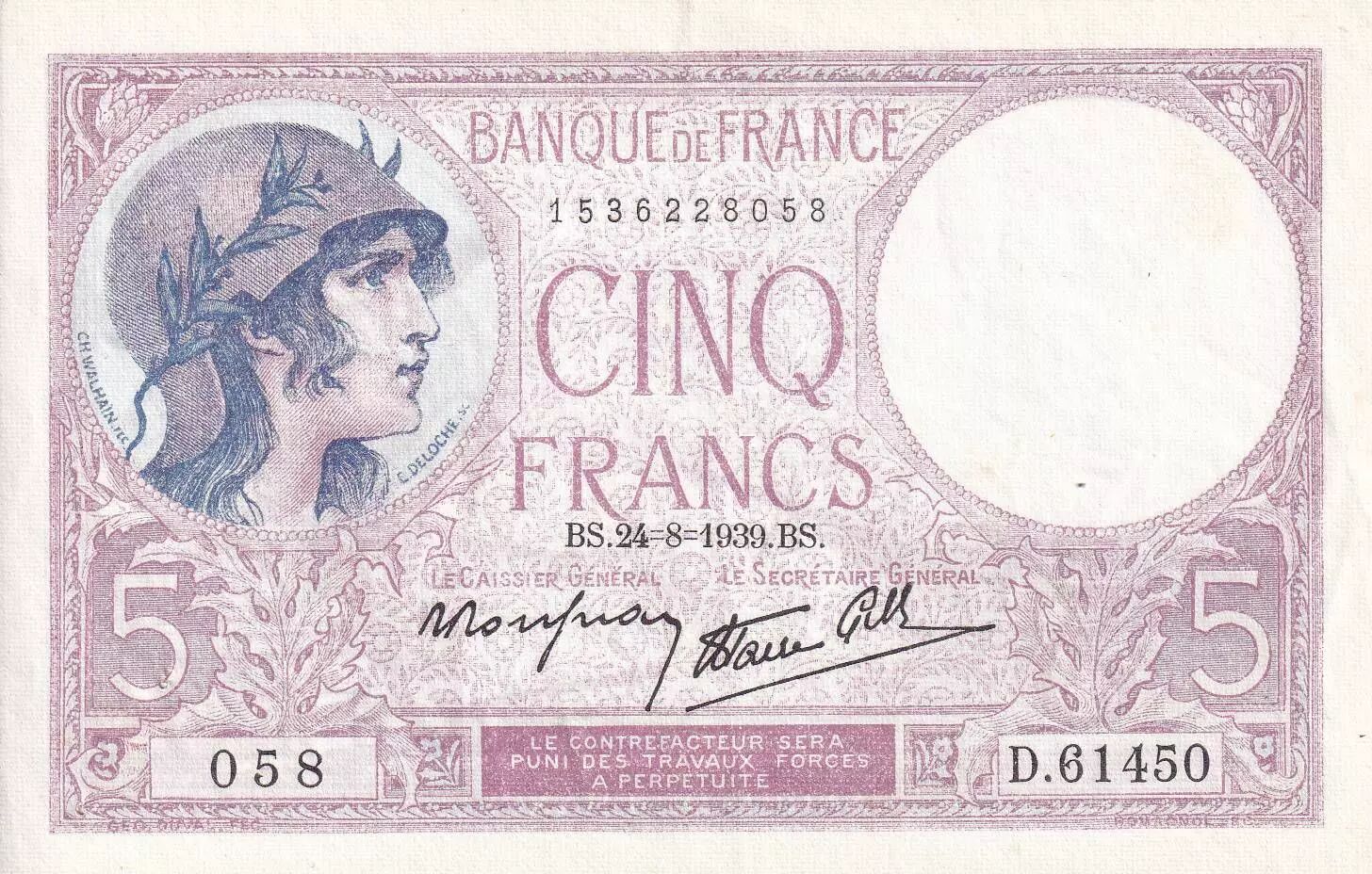 Accueil > Archivage > France 5 Francs - Violet - 24-08-1939 - Série D.61450 - SUP - F.04.07