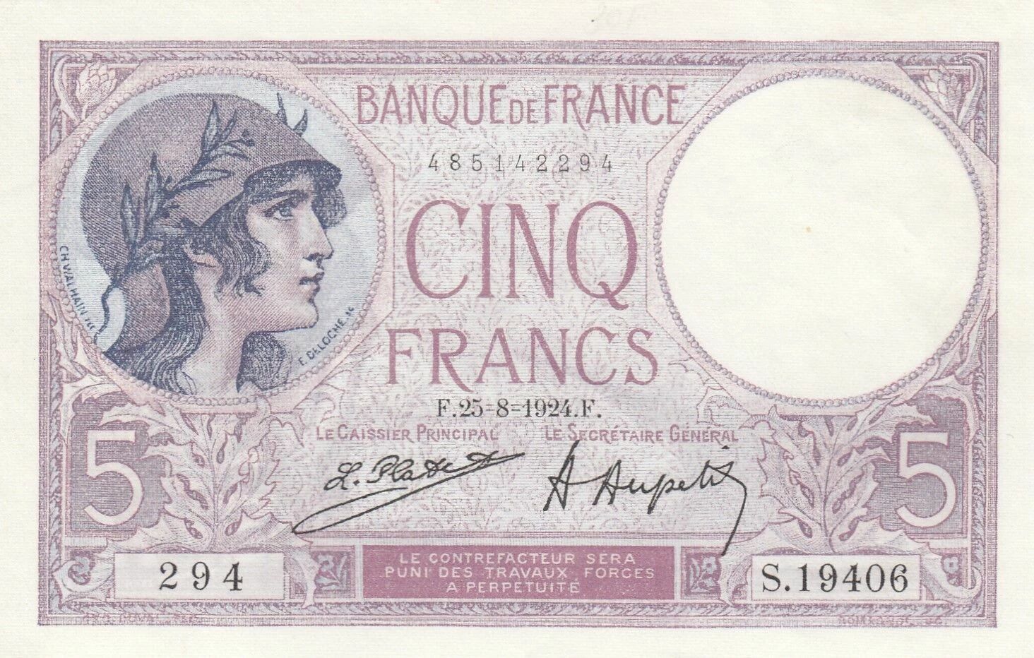 Here is a numismatic description of the 5 Francs - Violet - 25-08-1924 - Series S.19406 banknote: