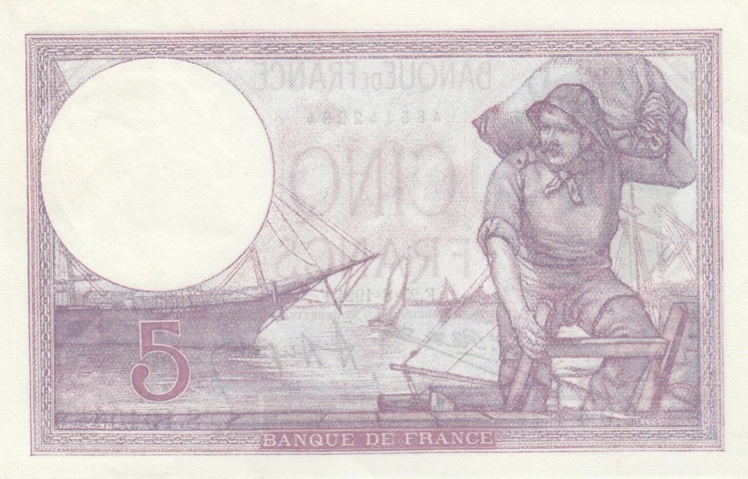 The reverse of the banknote continues the theme of allegory with a floral composition and ornamental motifs. The face value, "5 francs", is clearly indicated in numerals and letters. The banknote's watermark represents a helmeted woman's head, a symbol of the French Republic.