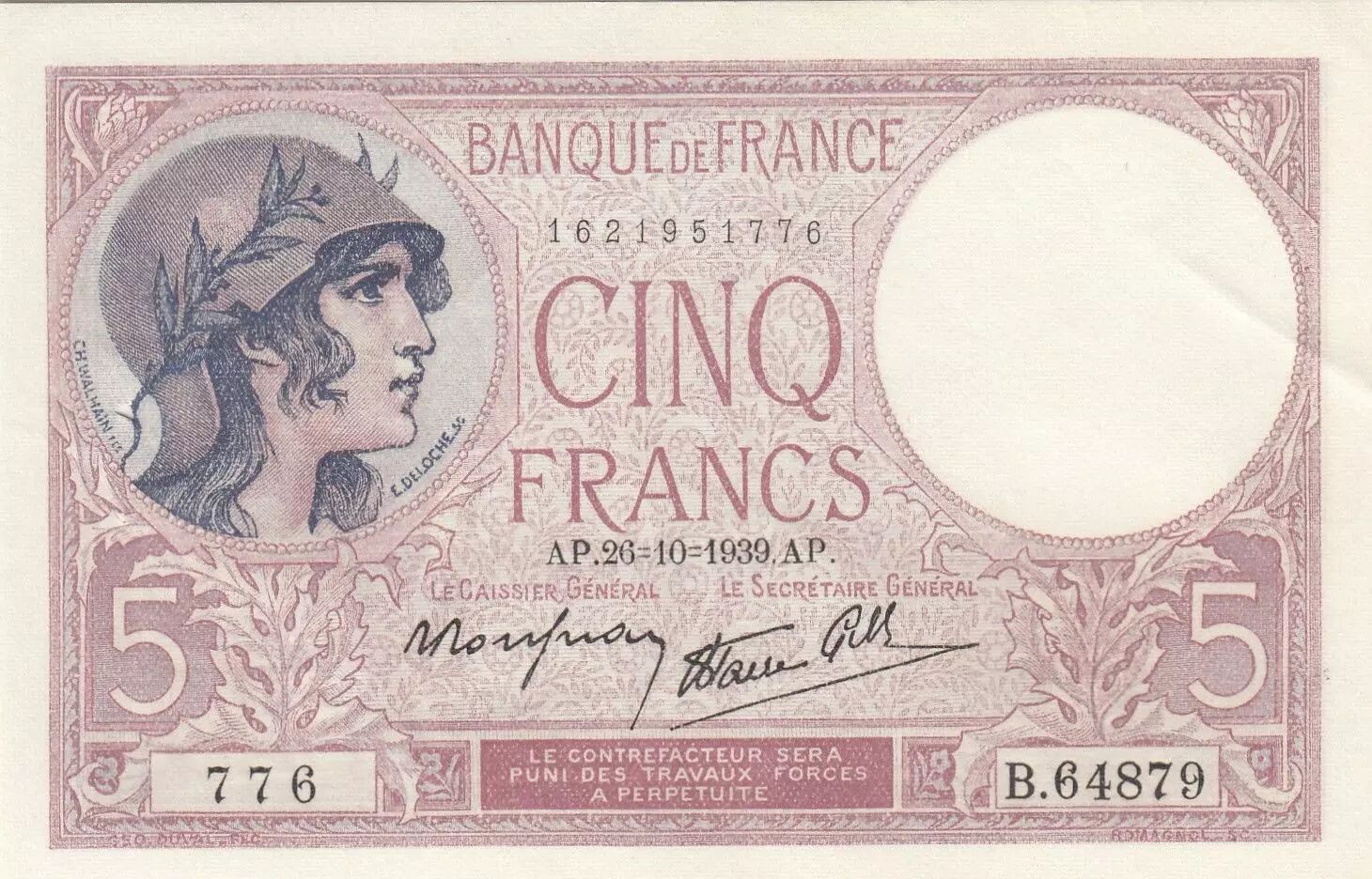 Billet France 5 Francs - Violet - 26-10-1939 - Série B.64879