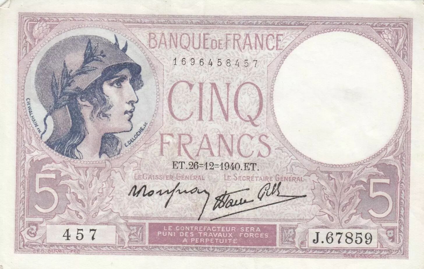 Accueil > Archivage > France 5 Francs - Violet - 26-12-1940 - Série J.67859