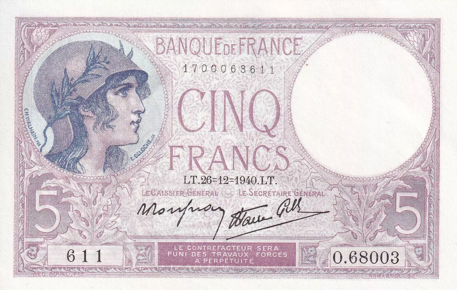 Accueil > Archivage > France 5 Francs - Violet - 26-12-1940 - Série O.68003 - F.04.18