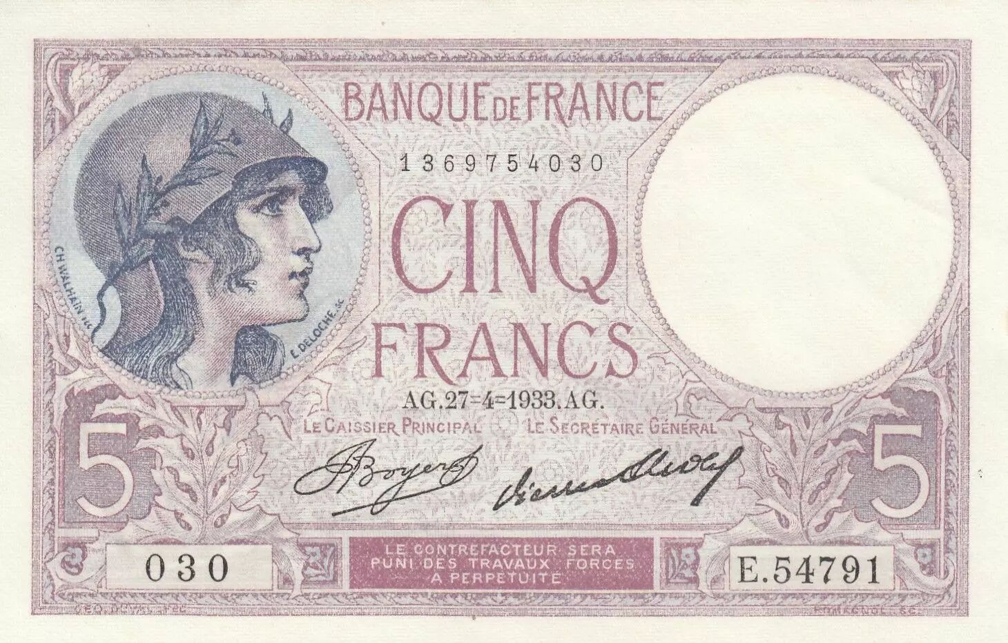 Accueil > Archivage > archivage-Billets Français > France 5 Francs - Violet - 27-04-1933 - Série E.54791