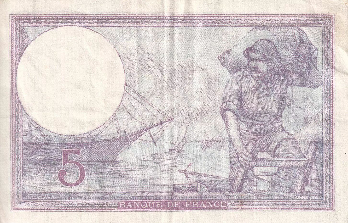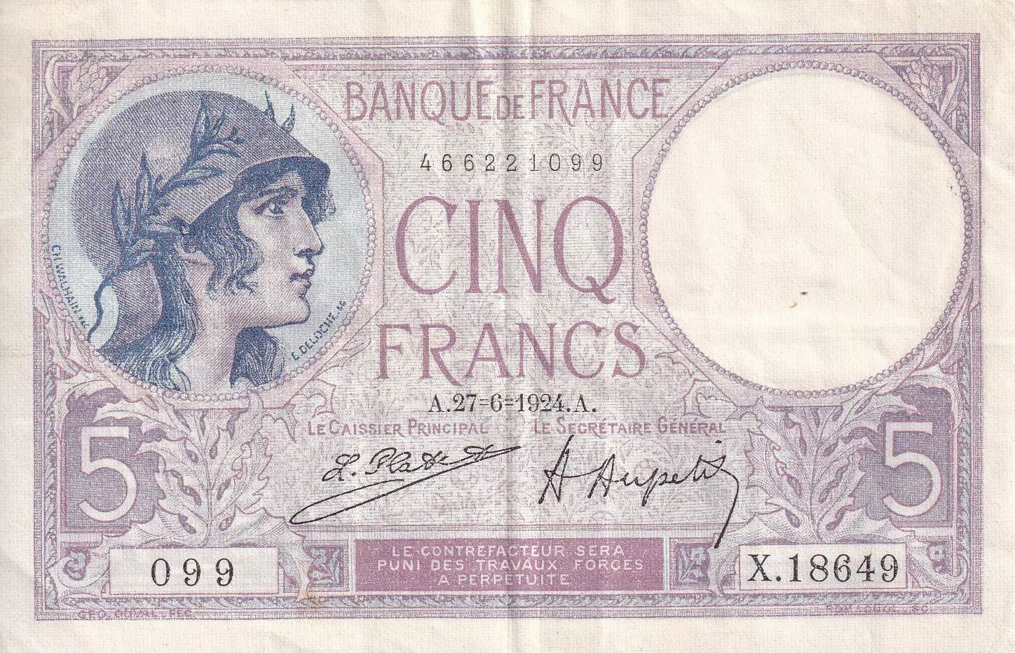 Accueil > Billets Français > Billets Banque de France > Billets 5 Francs > Violet type 1917 (1917-1940) > France 5 Francs - Violet - 27-06-1924 - Série X.18649 - F.03.08