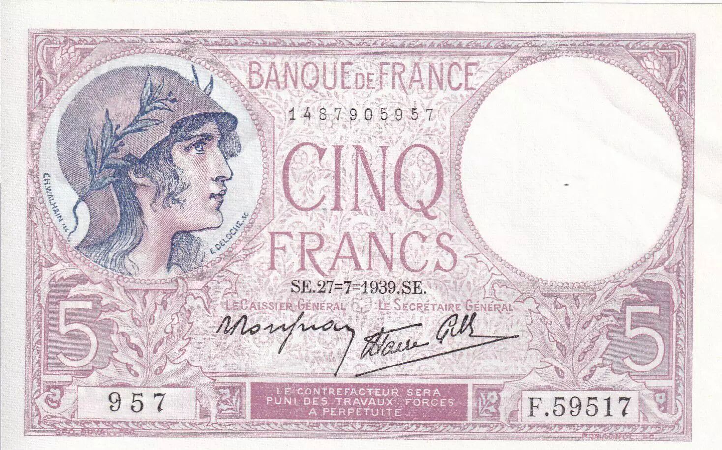 Accueil > Archivage > archivage-Archivage > France 5 Francs - Violet - 27-07-1939 - Série F.59517 - F.04.03