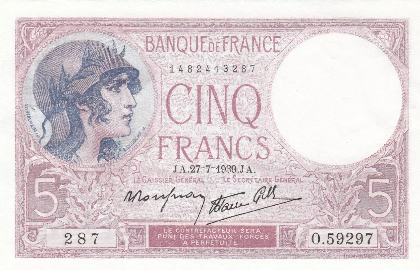 Billet France 5 Francs - Violet - 27-07-1939 - Série O.59297