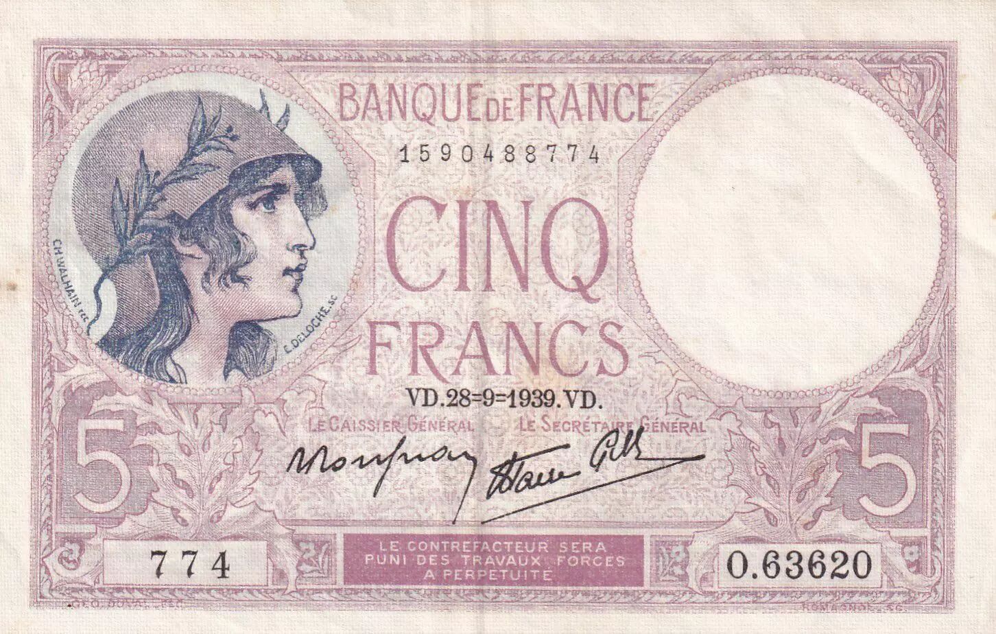 Accueil > Archivage > France 5 Francs - Violet - 28-09-1939 - Série O.63620-774 - F.04.10