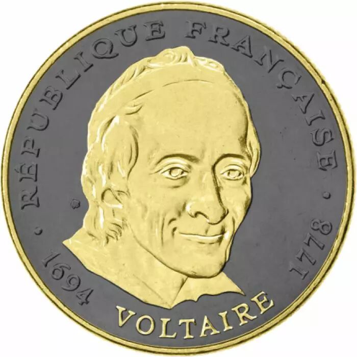 The legendary "5 Francs Voltaire" coin in a limited edition of 200 worldwide. Nickel coin with application of ruthenium and gold by a private institute.