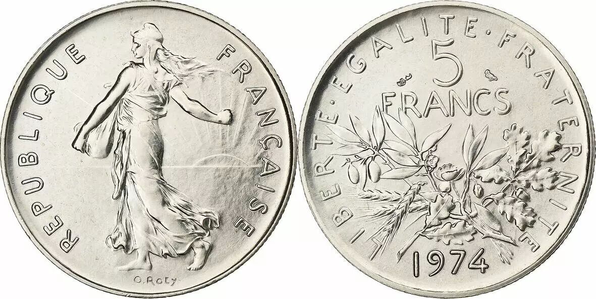 The 5 Francs Sower coin, minted in 1974, is a French coin with a face value of 5 francs. It is composed of copper and nickel, with a weight of 10 grams and a diameter of 29 millimeters.
