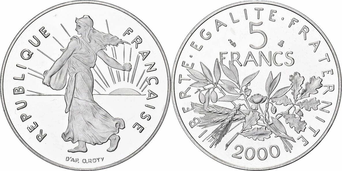 This 5 Francs coin, struck in Proof (BE) quality in the year 2000, is an issue of the French Republic. It is composed of Copper-Nickel, giving it a silver color.