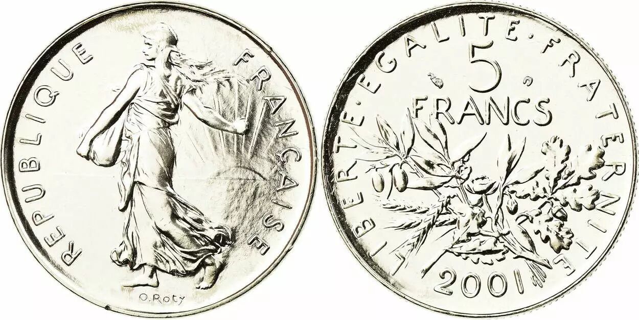 The 5 Francs Semeuse coin, minted in 2001, is a commemorative coin of the French Republic. Its face value is 5 francs.