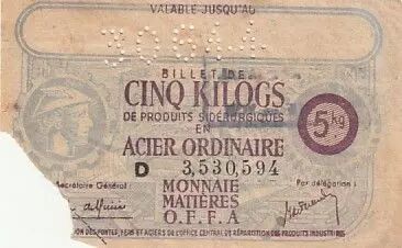 Accueil > Billets Français > Billets de Nécessités (1789-1945) > 1939-1945 > France 5 Kilos de Acier Ordinaire - Organisation des fontes, fers et aciers