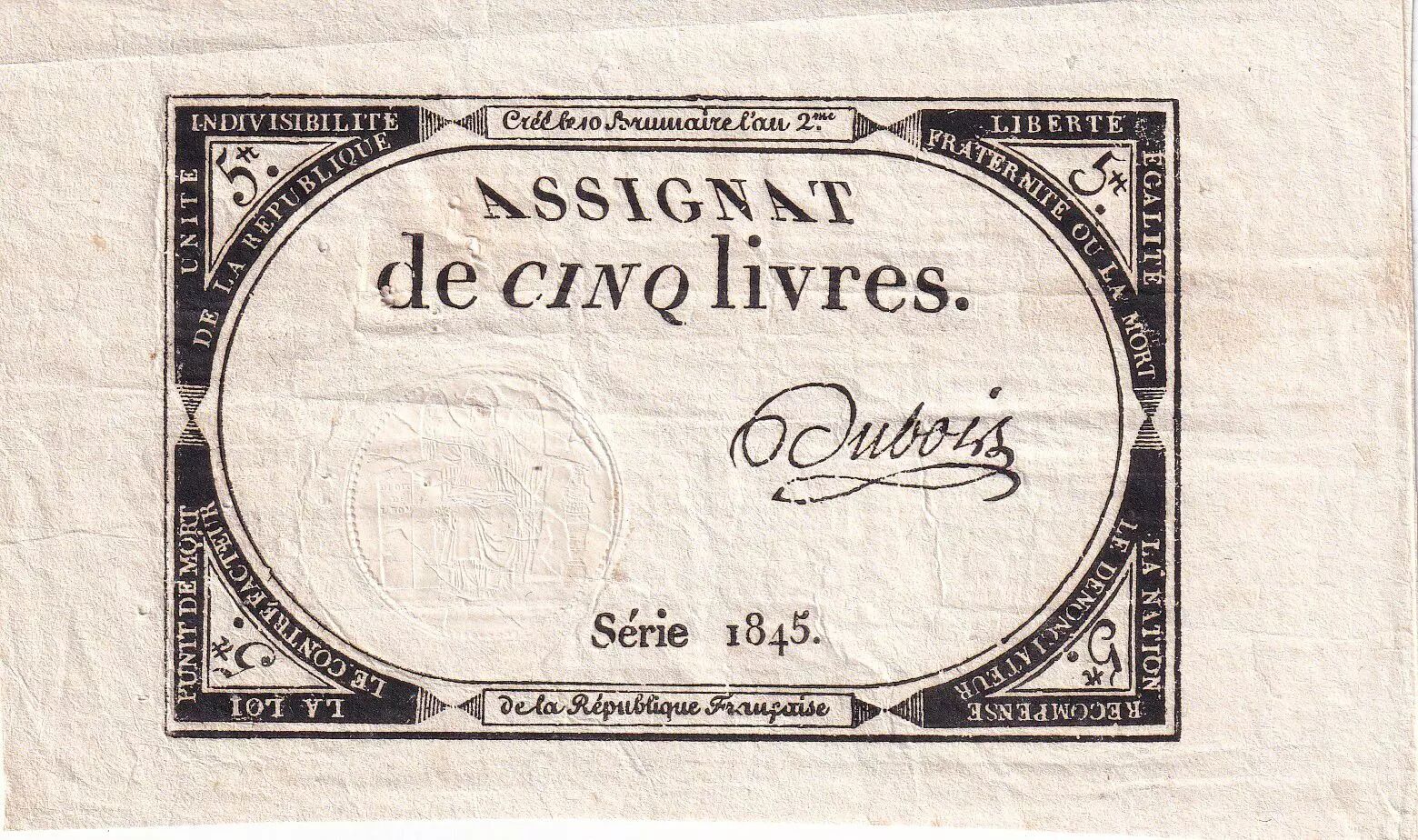 Billet France 5 Livres - 10 Brumaire An II (31-10-1793) - Sign Dubois - Série 1845 - L.171