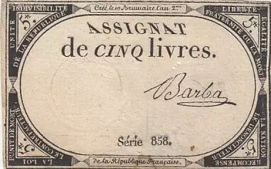 Billet France 5 Livres - 10 Brumaire An II (31.10.1793) - Sign. Barba - Série 858