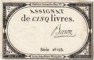 Billet France 5 Livres - 10 Brumaire An II (31.10.1793) - Sign. Baron - Série 26293