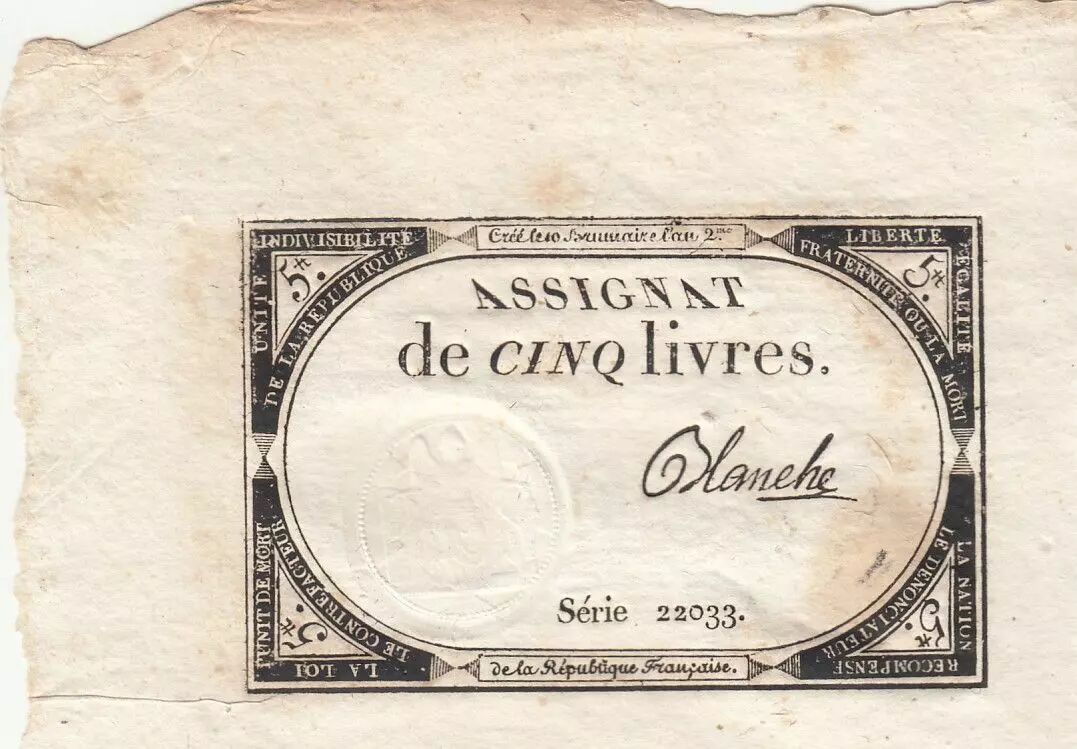 Banknote France 5 Livres - 10 Brumaire An II (31.10.1793) - Sign. Blanche - Serial 22033