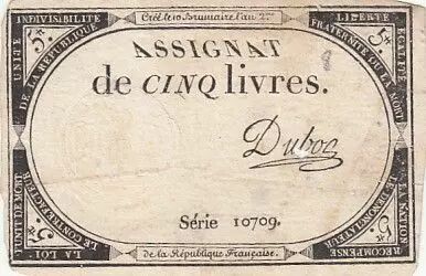 Billet France 5 Livres - 10 Brumaire An II (31.10.1793) - Sign. Duboc - Série 10709