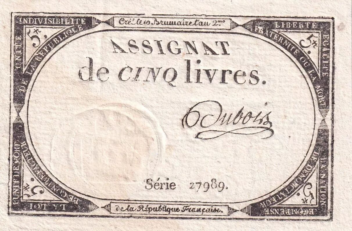 Billet France 5 Livres - 10 Brumaire An II (31.10.1793) - Sign. Dubois - Série 27989