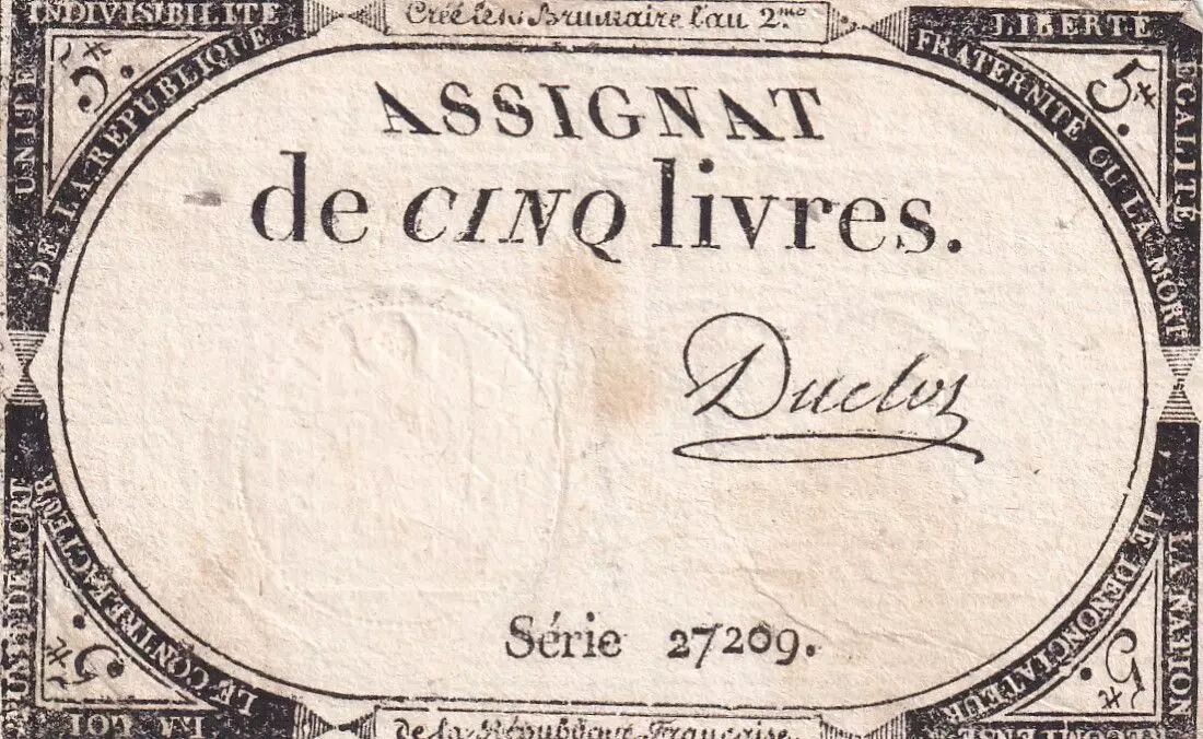 Accueil > Billets Français > Assignats > France 5 Livres - 10 Brumaire An II (31.10.1793) - Sign. Duclos - Série 27209
