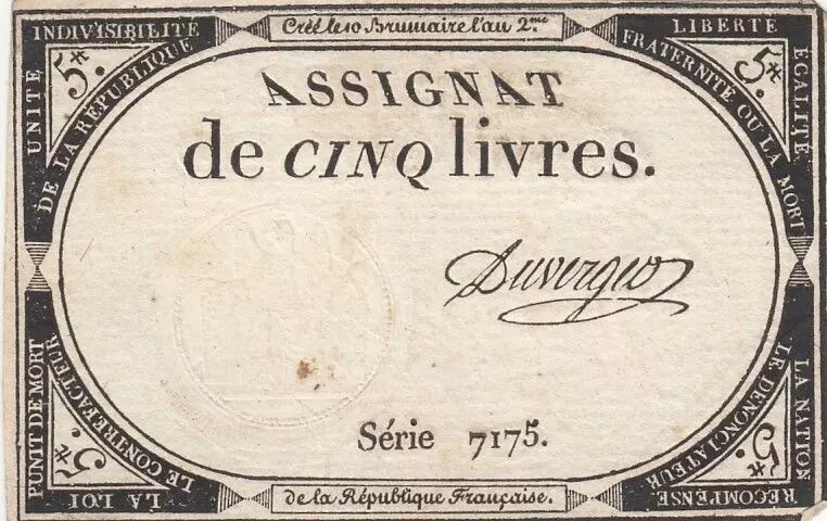 Billet France 5 Livres - 10 Brumaire An II (31.10.1793) - Sign. Duverger - Série 7175