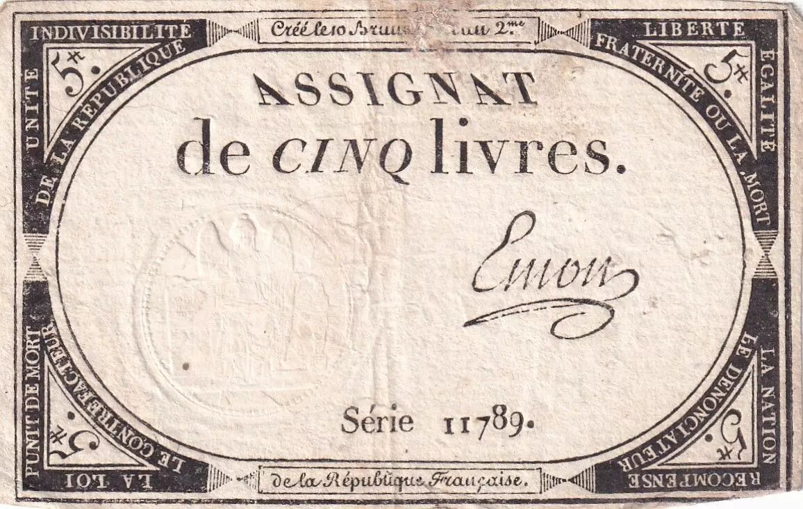 Billet France 5 Livres - 10 Brumaire An II (31.10.1793) - Sign. Emon - Série 11789