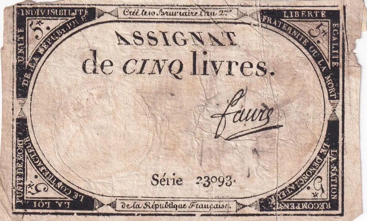 Billet France 5 Livres - 10 Brumaire An II (31.10.1793) - Sign. Faure - Série 23093