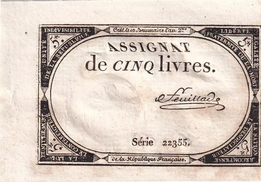 Ce billet est un assignat français d'une valeur nominale de cinq livres, émis le 10 Brumaire de l'an II (31 octobre 1793) du calendrier républicain français. Il s'agit d'une forme de monnaie fiduciaire émise pendant la Révolution française.