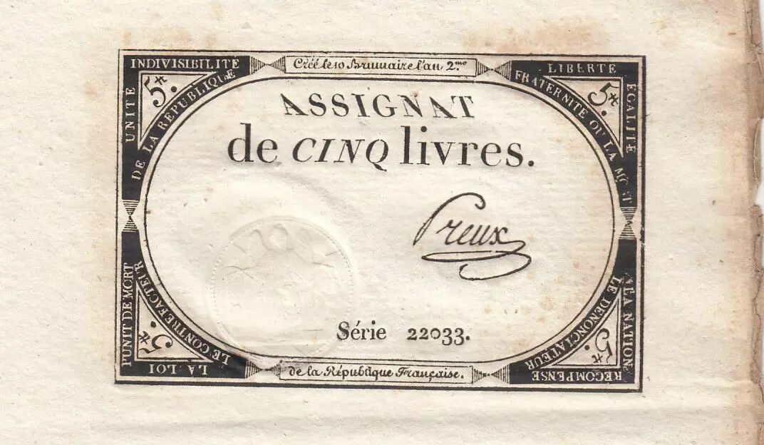 Banknote France 5 Livres - 10 Brumaire An II (31.10.1793) - Sign. Freux - Serial 22033