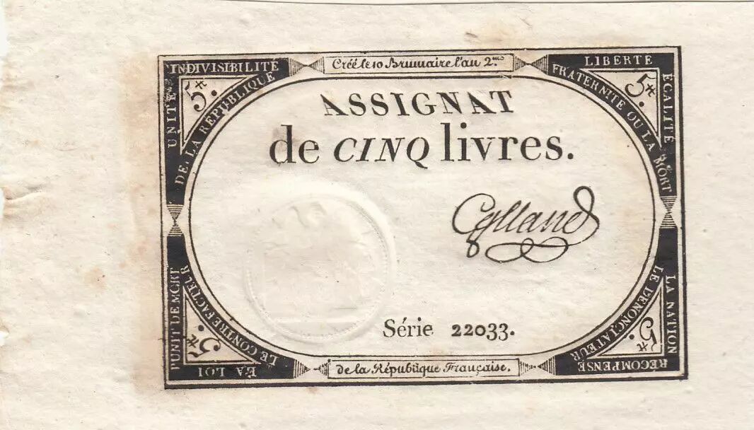 Banknote France 5 Livres - 10 Brumaire An II (31.10.1793) - Sign. Galland - Serial 22033