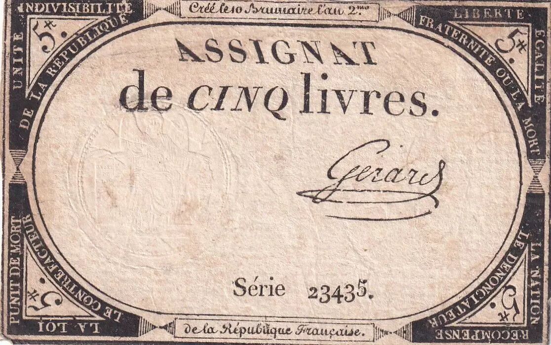 Accueil > Archivage > archivage-Billets Français > France 5 Livres - 10 Brumaire An II (31.10.1793) - Sign. Gerard - Série 23435
