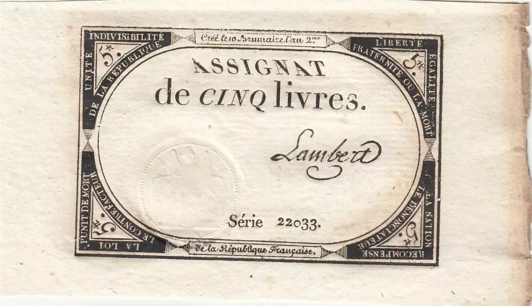 Banknote France 5 Livres - 10 Brumaire An II (31.10.1793) - Sign. Lambert - Serial 22033